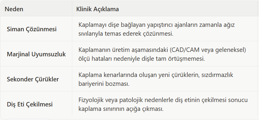 Kaplama dişlerin hava alması, restorasyon ile doğal diş dokusu arasındaki mikroskobik sızdırmazlığın bozulması sonucunda meydana gelir. Akademik çalışmalar, bu sızıntının temel nedenlerini şu şekilde sınıflandırmaktadır: